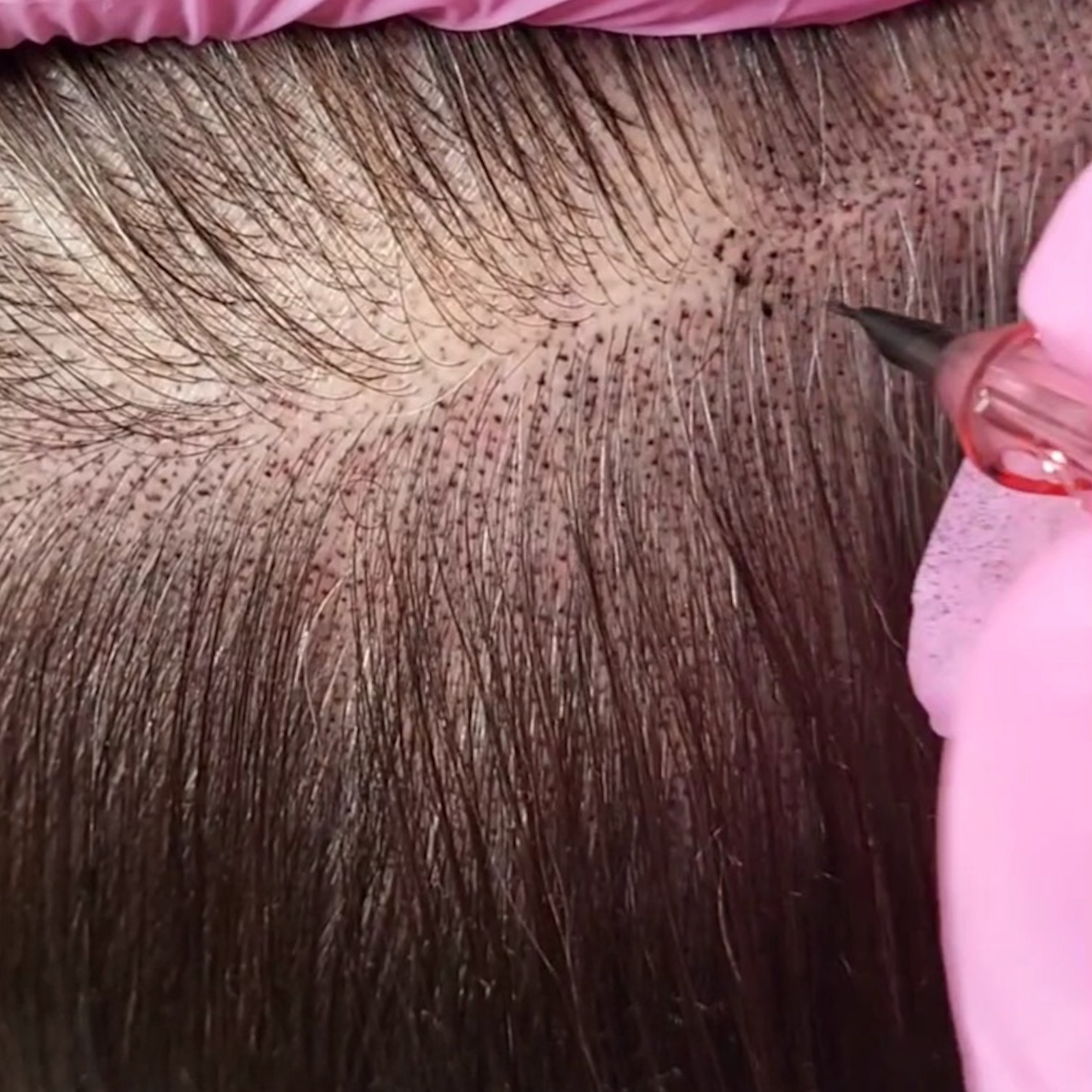 Elle peut aider à camoufler les cicatrices sur le cuir chevelu causées par des interventions chirurgicales, des traumatismes ou d’autres affections cutanées. Elle peut également être utilisée pour créer l’illusion de cheveux plus épais .